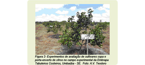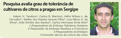 A Embrapa Tabuleiros Costeiros (Aracaju, SE) e a Embrapa Mandioca e Fruticultura (Cruz das Almas, BA), em parceria com a Empresa de Desenvolvimento Agropecuário de Sergipe – Emdagro, estão pesquisando novas cultivares copa e porta-enxerto de citros para o Estado de Sergipe. Uma das ações deste projeto é a avaliação da susceptibilidade de combinações de cultivares copa e porta-enxerto ao ácaro-da-falsa-ferrugem, à larva-minadora e às cochonilhas ortézia e escama-farinha, haja vista que diferentes cultivares podem responder de forma específica ao ataque dessas pragas. As avaliações estão sendo conduzidas no campo experimental da Embrapa Tabuleiros Costeiros em Umbaúba - SE (Figura 2) e se baseiam na comparação da população das pragas em diferentes combinações de cultivares copa e porta-enxerto ao longo do tempo.