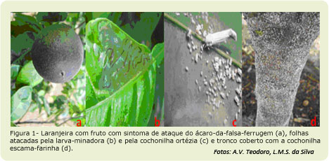 Diversas pragas atacam cultivos de citros em Sergipe, dentre as quais o ácaro-da-falsa-ferrugem (Phyllocoptruta oleivora), a larva-minadora (Phyllocnistis citrella) e as cochonilhas ortézia (Orthezia praelonga) e escama-farinha (Unaspis citri). O ácaro-da-falsa-ferrugem é considerado a principal praga de citros em Sergipe, causando danos consideráveis principalmente à qualidade da produção. Os frutos adquirem coloração enferrujada quando atacados precocemente ou bronzeada quando infestados tardiamente (Figura 1a).