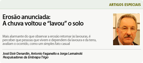 Nos últimos meses, a erosão observada em lavouras conduzidas sob plantio direto, no Rio Grande do Sul, em Santa Catarina e no Paraná, mais uma vez, tornou-se fato alarmante. A paisagem desoladora lembra cenas da década de 1970, quando era praticado o preparo convencional de solo. Lavouras conduzidas em plantio direto, sem a devida adoção de práticas conservacionistas associadas, novamente sucumbiram diante das chuvas do outono-inverno, apresentando intenso e preocupante processo erosivo.
