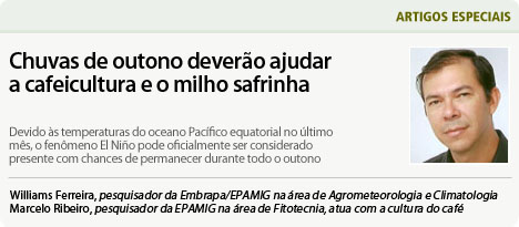A possibilidade de passagem de frentes frias neste final de semana pode trazer chuvas para o Sul de Minas Gerais. Apesar do início de ano desfavorável à cafeicultura, há 40% de probabilidade de as chuvas ocorrerem acima da média ao longo do próximo trimestre (abril, maio, junho) sendo porém maior essa probabilidade para os meses de abril e junho. Todavia, deve-se lembrar que de maneira natural as chuvas no outono são naturalmente reduzidas quando comparadas ao verão que chegou ao fim.
