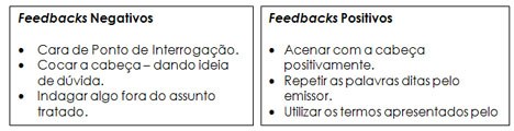 Se o feedback – reação feita à mensagem recebida – apresentado pelo cliente for do tipo negativo, o vende¬dor terá que procurar outra forma de comunicação, uma vez que sua mensagem não está sendo compreendida. Por outro lado, se o feedback for positivo o vendedor poderá continuar utilizando o mesmo tipo de comunica¬ção, uma vez que sua mensagem foi totalmente compreendida.