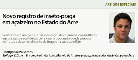 Este relato configura o primeiro registro de ocorrência da cigarrinha-das-frutíferas, associada às plantas de açaí-de-touceira no Estado do Acre. Estudos relacionados à dinâmica populacional do inseto, seus inimigos naturais, níveis de dano e métodos de controle são recomendados, a fim de traçar estratégias de monitoramento e controle de possíveis surtos populacionais dessa praga em plantios comerciais de açaí no estado.