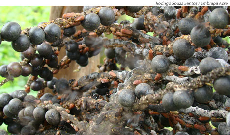 Cacho de açaí-de-touceira (Euterpe oleracea) infestado pela cigarrinha-das-frutíferas (Aetalion reticulatum), no campo experimental da Embrapa Acre