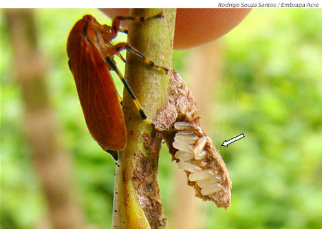 Detalhe de uma massa de ovos da cigarrinha-das-frutíferas, em ráquilas de açaizeiro