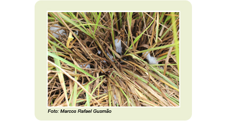 De acordo com ele, o dano do inseto praga está muito ligado ao seu hábito alimentar. Em relação às cigarrinhas das pastagens, como são insetos sugadores, tanto as formas jovens, que são as ninfas, quanto os adultos, que são aladas, sugam a seiva no xilema da planta. Ele diz que isso causa o amarelecimento da folhagem, podendo ocorrer uma redução da produção de matéria seca e uma eventual morte. Já no caso das formigas cortadeiras, insetos que têm importância principalmente na fase de implantação da pastagem, há o corte da folhagem, o que reduz o crescimento, podendo chegar à redução de estande.