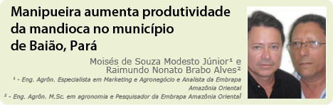 ALVES, R. N. B.; MODESTO JÚNIOR, M. de S.; ANDRADE, A. C. da S. O trio da produtividade na cultura da mandioca: estudo de caso de adoção de tecnologias na região no Baixo Tocantins, Estado do Pará. In: CONGRESSO DA ASSOCIAÇÃO BRASILEIRA DAS INSTITUIÇÕES DE PESQUISA TECNOLÓGICA, 2008, Campina Grande. Os desníveis regionais e a inovação no Brasil: os desafios para as instituições de pesquisa tecnológica. Brasília, DF: ABIPTI, 2008. 1 CD-ROM.