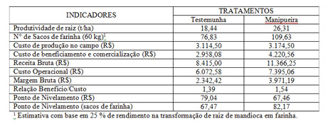 Foi feita uma análise econômica e pode-se observar que a maior margem bruta foi obtida com a adubação com manipueira, que foi de R$ 3.971,19, com relação benefício/custo de 1,54 significando que, para cada R$ 1,00 aplicado no sistema, obteve-se um ganho adicional de R$ 0,54, na comercialização da farinha de mandioca. A margem bruta calculada para a testemunha foi de R$ 2.342,42, com relação benefício/custo de 1,39, e retorno de R$ 1,39 para cada R$ 1,00 investido no sistema. Esses resultados são um indicativo de que ambos os tratamentos foram economicamente viáveis para o cultivo da mandioca em sistema de roça sem fogo (Tabela 1).