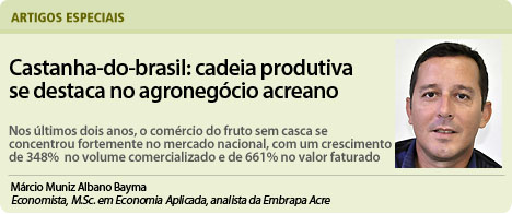 Nos últimos anos, poucas cadeias produtivas apresentaram tantas mudanças positivas quanto a da castanha-do-brasil no Estado do Acre. Essas mudanças foram motivadas por uma sequência de políticas públicas e pela estruturação de uma cooperativa de produtores. Dados preliminares indicam que para a safra 2012–2013 as estimativas de comercialização do produto continuam favoráveis.